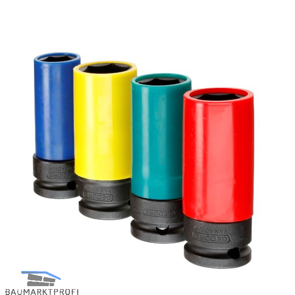 Kraftschraubereinsätze mit Schutzhülse, lange Form. Dünnwandig zum Schutz der Alu-Felgen. Kraftschraubereinsätze passend für alle gängigen Druckluft- und Elektroschrauber, mit Innenvierkantantrieb nach DIN 3121 - G 12,5, ISO 1174.