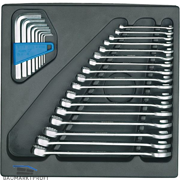 In 2/3 ES-Modul aus schlagfestem ABS-Kunststoff, Öl- und säurebeständig. Das Werkzeug liegt verrutschsicher in seinem Nest und ist vor Beschädigungen geschützt. Griffmulden erleichtern das Herausnehmen des Werkzeuges.