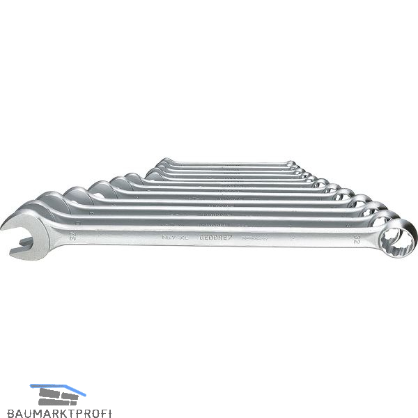 Marke: Gedore Schlüsselweite (mm): 8, 10, 11, 12, 13, 14, 16, 17, 18, 19, 22 Satzgröße: 11-tlg. DIN: 3113 A Profil: Unit Drive Ausführung: extra lang Oberfläche: verchromt Material: Chrom-Vanadium Stahl 31CrV3 Type: 7XL-0111