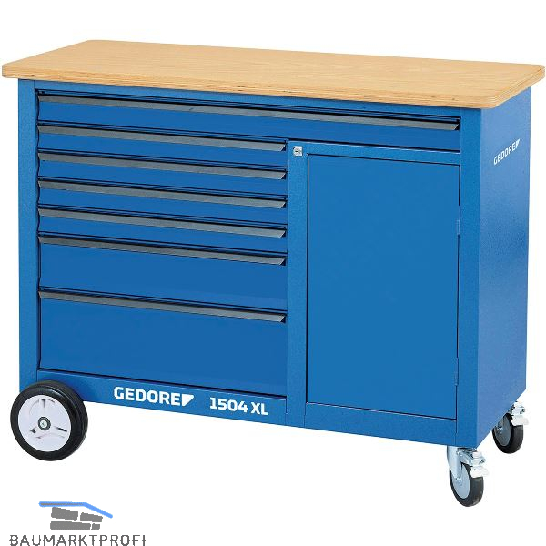 7 Schubladen mit Vollauszug. 30 mm starke Multiplex Buchen-Schichtholzplatte, Oberfläche durch Leinölfirnis zusätzlich geschützt. Großer Stauraum mit Fachboden und Tür. Sicherheit durch Fersenschutz für Personen. Stahlblech, korrosionsbeständig und kratzfest pulverbeschichtet. Zentralverriegelung mit Zylinderschloss. 1 XXL Schublade (B 1055 x T 400 mm) und 6 breite Schubladen (B 640 x T 400 mm) mit Vollauszug, herausnehmbar. Sicherheitsverriegelung je Schublade, Einhandbedienung. Kugelgelagerte Führungsschienen. Tragkraft pro Schublade 40 kg, untere Schwerlastschublade 60 kg. Hochleistungs-Fahrwerk: Gesamttragkraft 700 kg, im mobilen Betrieb 500 kg. 2 rollengelagerte Hochleistungsräder (Bockrollen Ø 200 mm), 2 kugelgelagerte Leichtlaufräder (Lenkrollen Ø 125 mm), beide mit Totalfeststeller. Trapez-Achskonstruktion bewirkt auch bei maximaler Belastung: Leichtlauf, Wendigkeit und Spurtreue.
