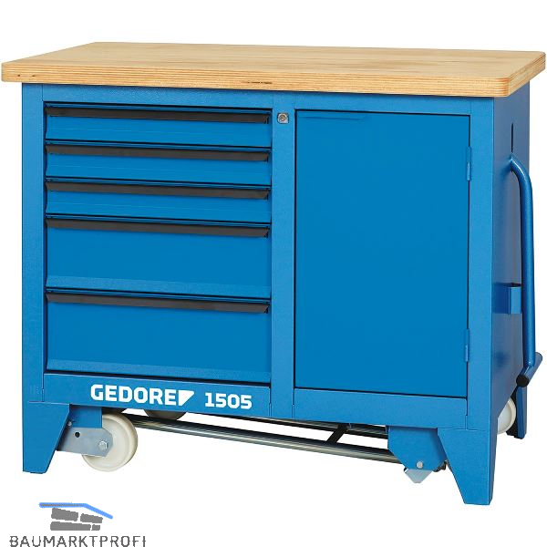 40 mm starke Multiplex Buchen-Schichtholzplatte, Oberfläche durch Leinölfirnis zusätzlich geschützt. Großer Stauraum mit Fachboden und Tür. Leichtes, sicheres Fahren durch Zuggriff. Sicherheit durch Fersenschutz für Personen. Stahlblech, korrosionsbeständig und kratzfest pulverbeschichtet. Zentralverriegelung mit Zylinderschloss, 5 breite Schubladen (B 480 x T 550 mm) mit Teilauszug (505 mm), herausnehmbar. Sicherheitsverriegelung je Schublade, Einhandbedienung. Kugelgelagerte Führungsschienen. Tragkraft pro Schublade 40 kg. Gesamttragkraft 2000 kg, im mobilen Betrieb 500 kg. 4 rollengelagerte Rollen mit Einzelradaufhängung. Im abgesenktem Zustand absolut fester Stand. Mobil durch hydraulisch gedämpfte Hebemechanik, Auslösung durch An- oder Absenken des Zuggriffes. Große Bodenfreiheit.
