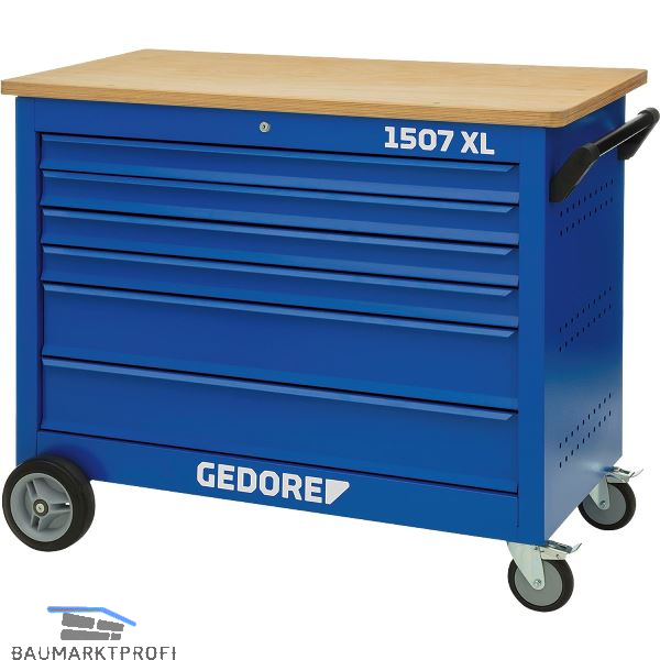 5 breite Schubladen mit Vollauszug. 30 mm starke Multiplex Buchen-Schichtholzplatte, Oberfläche durch Leinölfirnis zusätzlich geschützt. Nach hinten versetzte Arbeitsplatte ermöglicht bündiges Parken an der Wand. Ein Schubladenblock in Wagenbreite. Wendig und leicht zu steuern durch Fahr-Lenk-Griff. Seitenwände mit Euro-Lochung 10 x 38 mm zur Befestigung von Haken und Werkzeugen. Sicherheit durch Fersenschutz für Personen. Stahlblech, korrosionsbeständig und kratzfest pulverbeschichtet. Zentralverriegelung mit Zylinderschloss. Breite Schubladen (B 998 x T 474 mm) mit Vollauszug, herausnehmbar. Einzelauszugssperre verhindert das Öffnen von mehr als einer Schublade, Einhandbedienung. Kugelgelagerte Führungsschienen mit Selbsteinzug. Tragkraft pro Schublade 70 kg. Gesamttragkraft 700 kg, im mobilen Betrieb 500 kg. 2 rollengelagerte Hochleistungsräder (Bockrollen Ø 200 mm), 2 kugelgelagerte Leichtlaufräder (Lenkrollen Ø 125 mm), beide mit Totalfeststeller. Trapez-Achskonstruktion bewirkt auch bei maximaler Belastung: Leichtlauf, Wendigkeit und Spurtreue.