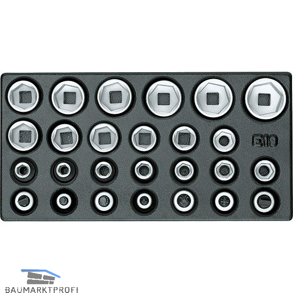 Inhalt: je 1 x Steckschlüsseleinsatz 1/2" 6-kant SW. 10, 11, 12, 13, 14, 15, 16, 17, 18, 19, 21, 22, 23, 24, 26, 27, 28, 30, 32 mm,