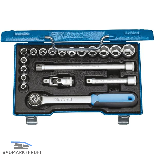 Mit geschmiedeten, vergüteten handbetätigten 6-kant UD-Profil Steckschlüsseleinsätzen. Mit extra feinverzahnter Umschaltknarre. Im blauen Stahlblechkasten.
