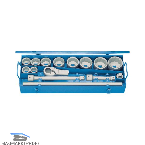Mit geschmiedeten, vergüteten 12-kant Unit Drive-Profil-Einsätzen und Betätigungswerkzeugen in blauer Stahlblechkassette.