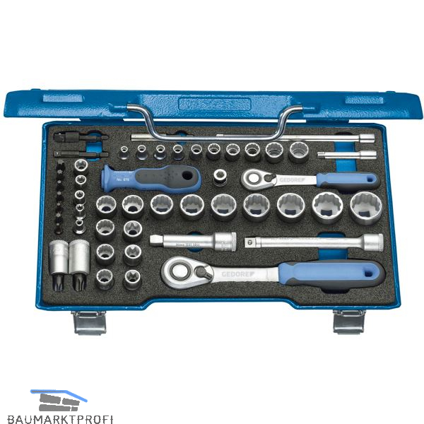 Zusammenstellung für den Automotiv-Bereich und Industrie. Einsätze 3/8" und 1/4" für Innen- und Außen-Torx® Schrauben. Mit robusten Hebel-Umschaltknarren mit Druckknopfauslösung. Im blauen Stahlblechkasten mit Check-Tool Einlage.