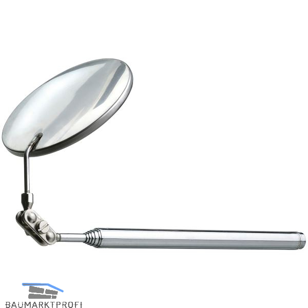 Zur Inspektion von nicht direkt einsehbaren Bereichen. Spiegel aus widerstandsfähigem Mineralglas, Ø 30 mm, 360° schwenkbar. Teleskopgriff verstellbar von 130 bis 670 mm, Griff aus Messing, Spiegelfassung aus rostfreiem Stahl, Vernickelt. Resistent gegen Öle, Fette und Bremsflüssigkeit.