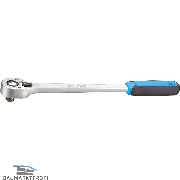 Für erhöhtes Drehmoment, lange Ausführung. Mit tiefergelegtem Umschalthebel, mit Druckknopfauslösung, Rückschwenkwinkel 7,5 Grad. Rutschfester 2-K-Griff mit Aufhängeloch. Ratschensperre in Mittenstellung: Beim Umschalten rastet der Schalthebel automatisch für Rechts- oder Linksgang ein. Für handbetätigte Steckschlüsseleinsätze mit Verbindungsvierkant C 12,5 DIN 3120 - ISO 1174, mit Kugelarretierung.