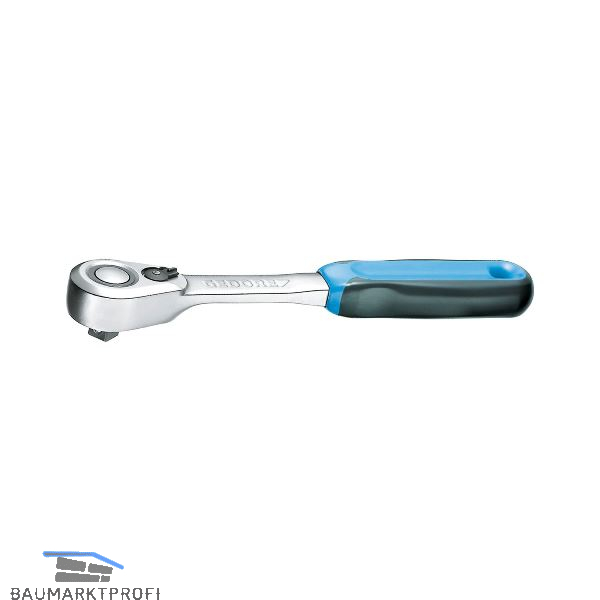 Feinverzahnt mit Umschalthebel und Druckknopfauslösung. 2 Komponenten-Griff mit Aufhängeloch. Für handbetätigte Steckschlüsseleinsätze mit Verbindungsvierkant C 10 DIN 3120 - ISO 1174, mit Kugel-Arretierung.