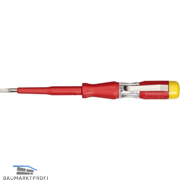 Für 220-250 Volt Wechselspannung, Klinge vernickelt, vollisoliert entsprechend DIN VDE 0680-6. Spannungsprüfer 60mm mit Metallclip und gelber Kappe.