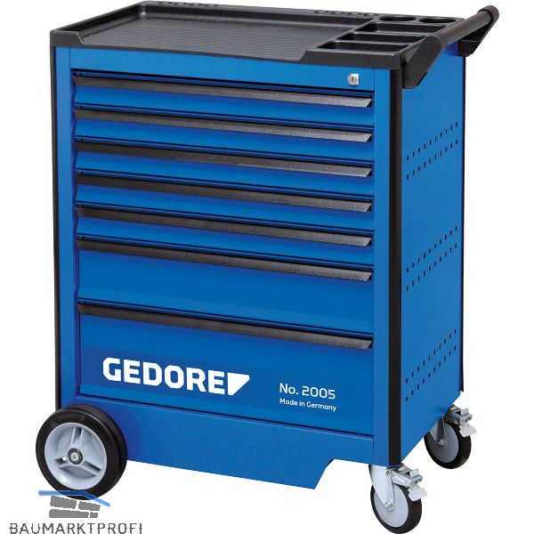 Mit 6 Schubladen, Tragkraft pro Schublade 40 kg, untere Schwerlastschublade Tragkraft 60 kg, Beide Seitenwände mit Vierkantlochung 10 x 38 mm zur Befestigung von Haken und Werkzeugen, Sicherheit durch Fersenschutz und Kanten-Rammschutz für Personen und Umfeld. Stahlblech, korrosionsbeständig und kratzfest pulverbeschichtet. Zentralverriegelung mit Zylinderschloss, Arbeitsplattform aus ABS-Kunststoff mit drei Kleinteilefächern, 2 Dosenablagen, 8 Schraubendreherablagen. Gesamttragkraft 500 kg. 2 rollengelagerte Bockrollen ø 200 mm, 2 kugelgelagerte Lenkrollen ø 125 mm beide mit Totalfeststeller.