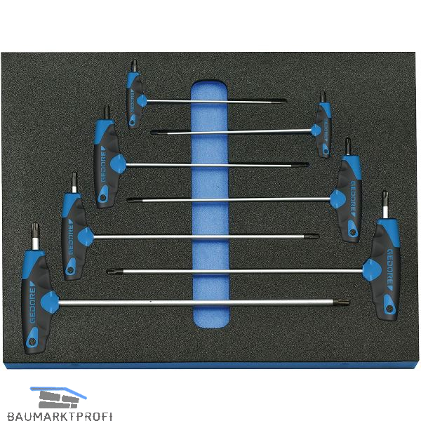 Inhalt: je 1 x Winkelschraubendreher mit 2K-T-Griff Innen-Torx® TX10, TX15, TX20, TX25, TX27, TX30, TX40.