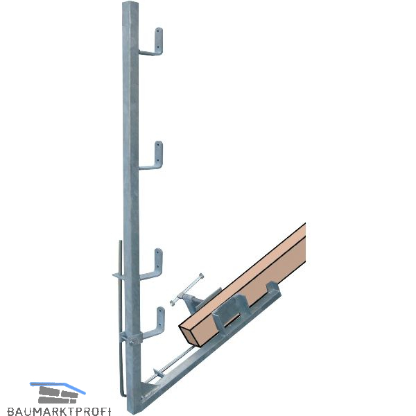 Zertifiziert nach EN 13374 Klasse C, und daher einsetzbar bis 60º Dachneigung. Bei allen Dacharbeiten einsetzbar - sogar die Dachrinne kann problemlos montiert werden. Ausreichende Netzhöhe auch bei steilen Dächern. Stabile feuerverzinkte Ausführung für Ihre Sicherheit. Geländerabstand max. 200 cm. Für Sparrenbreite von 5-25 cm. Mit Hebel für Lösemechanismus.