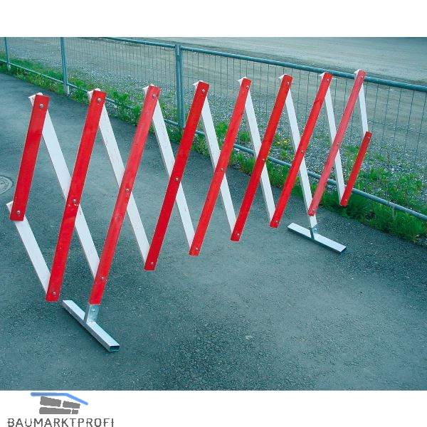 Scherengitter aus Holz, rot/weiß lackiert. Gut sichtbare Absperrung, leicht zusammenlegbar. Mit Füßen aus verzinktem Stahl.