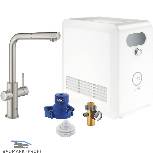 Der für die Inbetriebnahme notwendige Grohe Blue Filter, die 2 Kg CO2 Flasche (40 423 000) und die Reinigungskartusche (40 434 001) sind nicht im Lieferumfang enthalten und müssen separat bestellt werden.
