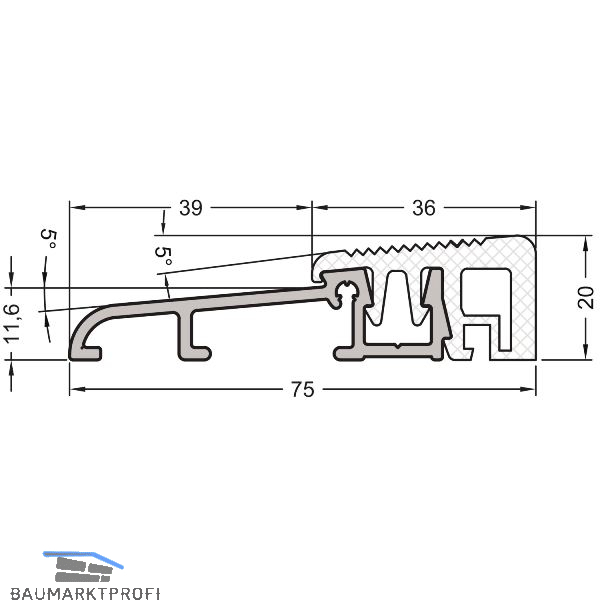 Marke: Gutmann Type: Weser 75 TI Breite (mm): 75 Höhe (mm): 20 Material: Aluminium silber eloxiert Länge (mm): 6000 Dienstleistung: Zuschnitt auf Maß gegen Aufpreis