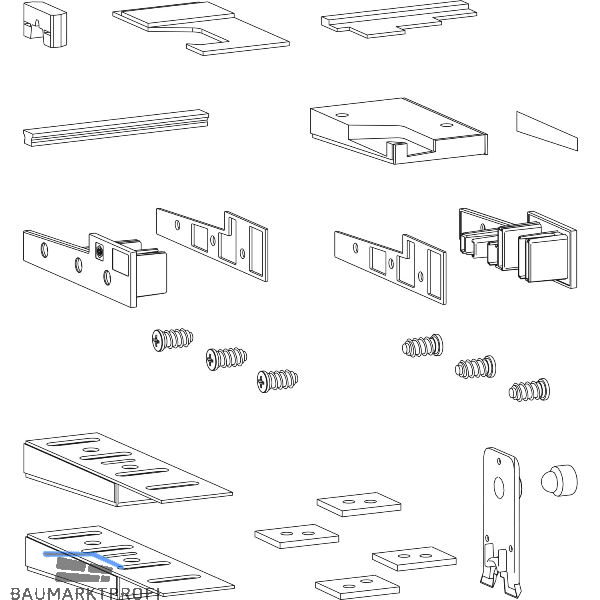 Gummipilzpuffer, Dichtungsplatte Laufschiene, Dichtkissen Mittelstoß (Schwelle), Dichtkissen Mittelstoß (Flügel), Flügelanschlag unten, Endkappen Bodenschwelle, Dichtungen für Endkappen Bodenschwelle, Befestigungsschrauben für Endkappen Bodenschwelle, Rahmeneckverbinder, Dichtblock, Dichtkissen Rahmeneckverbinder, Unterlegteile Bodenschwelle, Dichtung Laufschiene-Aufnahmenut