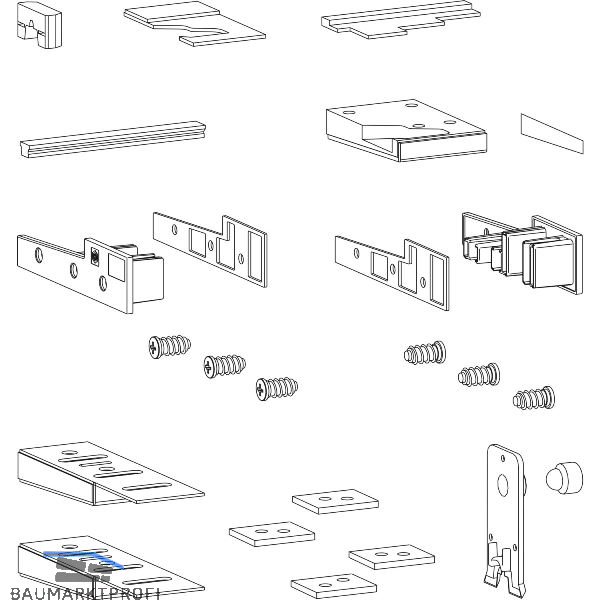 Gummipilzpuffer, Dichtungsplatte Laufschiene, Dichtkissen Mittelstoß (Schwelle), Dichtkissen Mittelstoß (Flügel), Flügelanschlag unten, Endkappen Bodenschwelle, Dichtungen für Endkappen Bodenschwelle, Befestigungsschrauben für Endkappen Bodenschwelle, Rahmeneckverbinder, Dichtblock, Dichtkissen Rahmeneckverbinder, Unterlegteile Bodenschwelle, Dichtung Laufschiene-Aufnahmenut