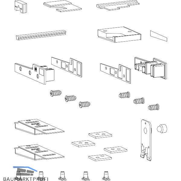 Gummipilzpuffer, Dichtungsplatte Laufschiene, Dichtkissen Mittelstoß (Schwelle), Dichtkissen Mittelstoß (Flügel), Flügelanschlag unten, Endkappen Bodenschwelle, Dichtungen für Endkappen Bodenschwelle, Befestigungsschrauben für Endkappen Bodenschwelle, Rahmeneckverbinder, Dichtblock, Dichtkissen Rahmeneckverbinder, Unterlegteile Bodenschwelle, Dichtung Laufschiene-Aufnahmenut, Laufwagenpositionierung