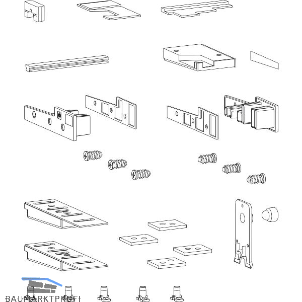 Gummipilzpuffer, Dichtungsplatte Laufschiene, Dichtkissen Mittelstoß (Schwelle), Dichtkissen Mittelstoß (Flügel), Flügelanschlag unten, Endkappen Bodenschwelle, Dichtungen für Endkappen Bodenschwelle, Befestigungsschrauben für Endkappen Bodenschwelle, Rahmeneckverbinder, Dichtblock, Dichtkissen Rahmeneckverbinder, Unterlegteile Bodenschwelle, Dichtung Laufschiene-Aufnahmenut, Laufwagenpositionierung