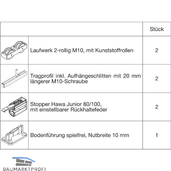 Ohne Laufschiene. Mit 2 Fangstopper Standard. Für minimale Einbauhöhe.