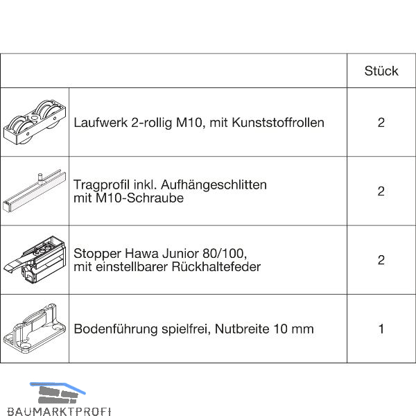 Ohne Laufschiene. Mit 2 Fangstopper Standard. Für minimale Einbauhöhe.