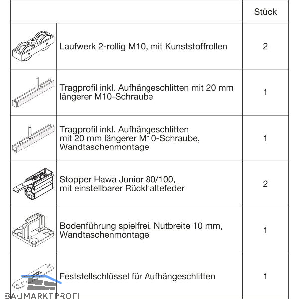 Ohne Laufschiene. Mit 2 Fangstopper Standard. Für minimale Einbauhöhe. Wandtaschenmontage.