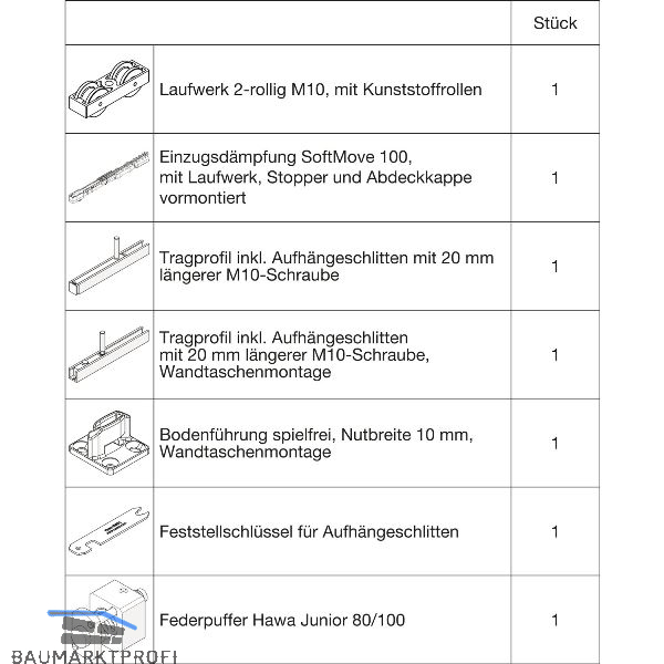 1 Einzugsdämpfung SoftMove 100 inkl. Laufwerk, Stopper und Abdeckkappe