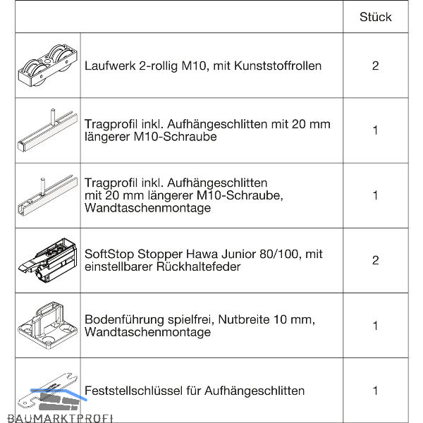 1 Tragprofil mit Aufhängeschlitten und 20 mm längerer M10-Aufhängeschraube, Wandtaschenmontage