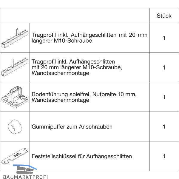 1 Tragprofil mit Aufhängeschlitten und 20 mm längerer M10-Aufhängeschraube, Wandtaschenmontage