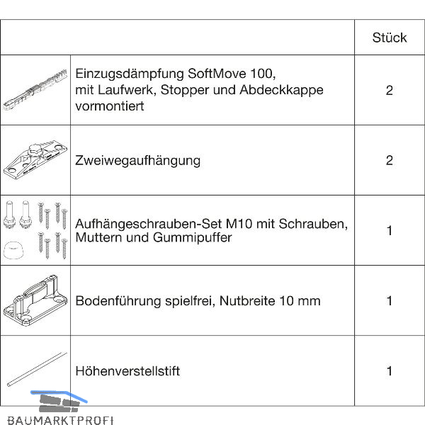 Lieferumfang:2 Einzugsdämpfungen SoftMove 100 inkl. Laufwerk, Stopper und Abdeckkappe2 Zweiwegaufhängungen1 Aufhängeschrauben-Set M101 Bodenführung1 Höhenverstellstift