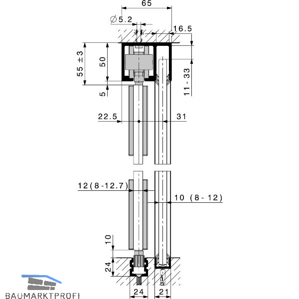 Laufschienenset mit integrierter Festverglasungsaufnahme.