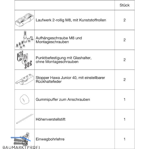 Ohne Laufschiene, ohne Abdeckkappen.