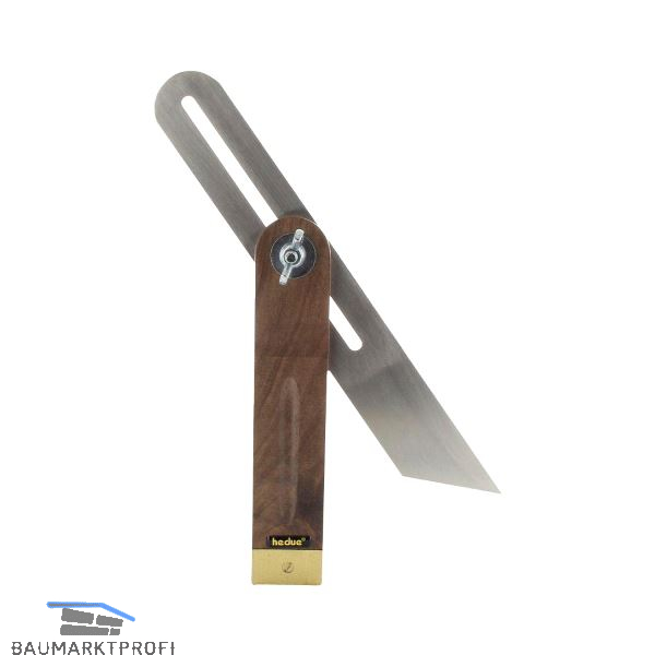 Schmiege zum Abnehmen, Anreißen und Übertragen von beliebigen Winkeln. Das Langloch in der Edelstahlzunge ermöglicht Innenmessungen und wird mit einer Flügelmutter arretiert. Die gefrästen Kehlen an der Griffober- und unterseite sorgen für angenehme Handhabung. Griff aus Nussbaum, mit Messingbeschlag. Zunge aus Edelstahl.
