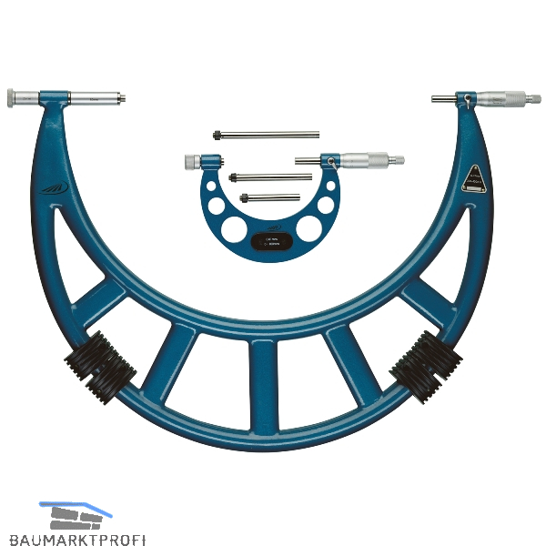 Bügelmessschraube mit auswechselbarem Amboss, Ableseteile mattverchromt, Messkraftregelung durch Gefühlsratsche, inkl. Einstellmaß, HM Messflächen, Handwärmschutz. Im Holzetui.