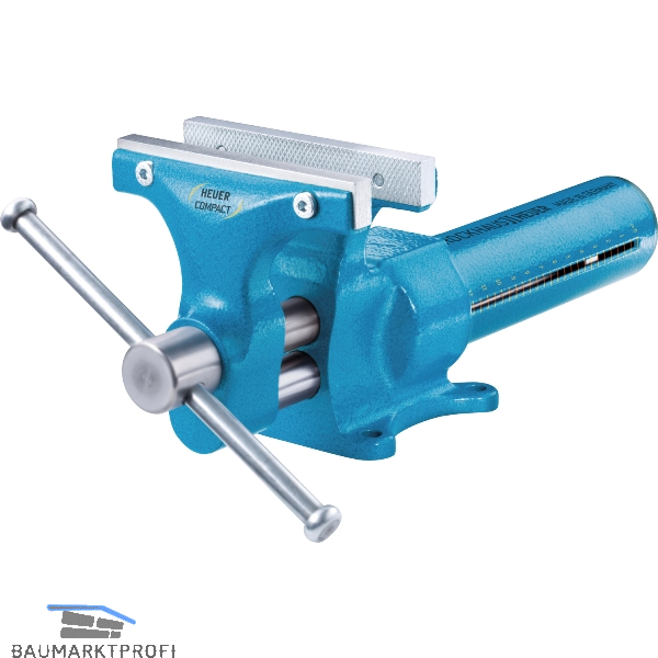 Ganz aus Stahl geschmiedet, garantiert unzerbrechlich. Hinterbacke mit Amboss, Schnellverstellung durch HEUER Quicklaunch in 3 Sekunden. Integrierte Öffnungsweitenanzeige. Dabei wird die Parallelität der Backen beim Spannen nicht vom Spiel der Spindel beeinflusst, das für eine optimal funktionierende Schnellverstellung benötigt wird. Druckfeder arretiert an der gewünschten Position und ist audiovisuell wahrnehmbar. Auswechselbare und wendbare Backen mit glatter und geriffelter Spannfläche, integrierte Rohrspannbacken.