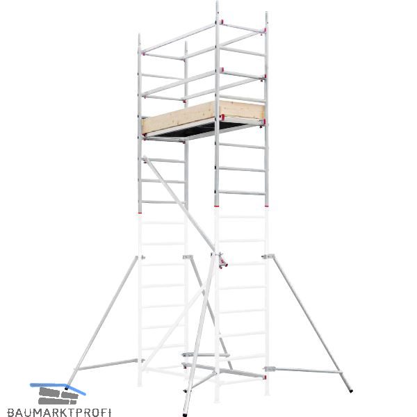 Rahmenteilbreite 0,72 m, Bühnenlänge 1,58 m, zulässige Belastung 200 kg (2,0 kN) verteilte Last, entspricht 200 kg/m² (2,0 kN/m²) gemäß Gerüstgruppe 3, DIN EN 1004. Vier bremsbare Lenkrollen inklusive. Schneller Auf-und Abbau durch Klickverschlüsse an Streben und Diagonalen.