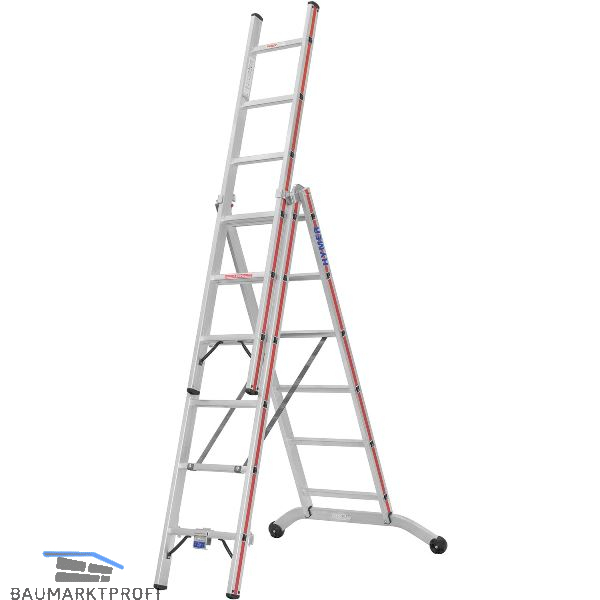 Kombinierbare Steh- und Schiebeleiter mit vielen verschiedenen Verwendungsmöglichkeiten. Leiterinnenbreite 300 mm (Oberteil), Sprossen aus stark profiliertem Strangpressprofil, daher erhöhte Rutschfestigkeit. Zwei starre Streben gegen unbeabsichtigtes Zusammenklappen ab Größe 3 x 7. Mit Holm verschraubte Leiterfüße im Anstellwinkel mit großer Auflagefläche und hoher Standfestigkeit. Gebogene Traverse mit 125 mm Bodenfreiraum, massive Stahlbeschläge. Ab Größe 3 x 10 mit Wandlaufrollen aus Kunststoff, stabile Aussteifungsstreben am Antritt. Klemmbeschlag zur Verwendung der Leiter in Treppenstellung bis Größe 3 x 9 serienmäßig vormontiert. Tragkraft 150 kg.