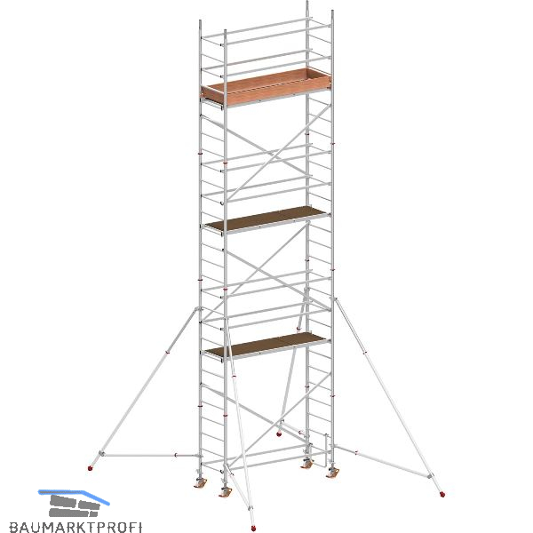 bestehend aus: 6 x Rahmenteil 8 Sprossen, 2 x Rahmenteil 4 Sprossen, 3 x Bühne mit Durchstiegsklappe, 1 x Einstiegsbügel, 2 x Bordbrett Längsseite, 2 x Bordbrett Stirnseite, 6 x Diagonale, 14 x Verstrebung, 4 x Ausleger Basisteil, 4 x Ausleger Erweiterungsteil, 4 x Lenkrolle ø 200 mm mit Spindel, 12 x Sicherungsstecker