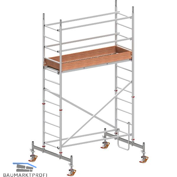 bestehend aus: 2 x Rahmenteil 8 Sprossen, 2 x Rahmenteil 4 Sprossen, 2 x Geländerteil, 1 x Bühne mit Durchstiegsklappe, 1 x Einstiegsbügel, 2 x Bordbrett Längsseite, 2 x Bordbrett Stirnseite, 4 x Bordbretthalter, 2 x Diagonale, 6 x Verstrebung, 2 x Traverse, 4 x Lenkrolle ø 200 mm mit Spindel, 4 x Sicherungsstecker