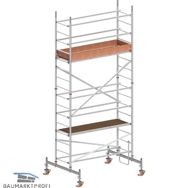bestehend aus: 4 x Rahmenteil 8 Sprossen, 2 x Geländerteil, 2 x Bühne mit Durchstiegsklappe, 1 x Einstiegsbügel, 2 x Bordbrett Längsseite, 2 x Bordbrett Stirnseite, 4 x Bordbretthalter, 4 x Diagonale, 10 x Verstrebung, 2 x Traverse, 4 x Lenkrolle ø 200 mm mit Spindel, 4 x Sicherungsstecker