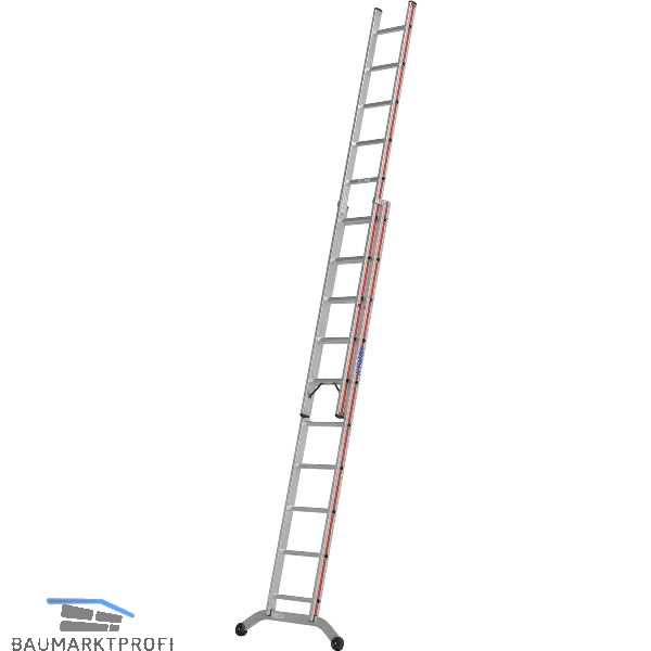 Leiterinnenbreite 300 mm (Oberteil), Sprossen aus stark profiliertem Strangpressprofil, daher erhöhte Rutschfestigkeit. Hochwertige Stahlbeschläge mit Kunststoffgleitern (erleichtertes Ein- und Ausfahren der Leiter). Tragkraft 150 kg.