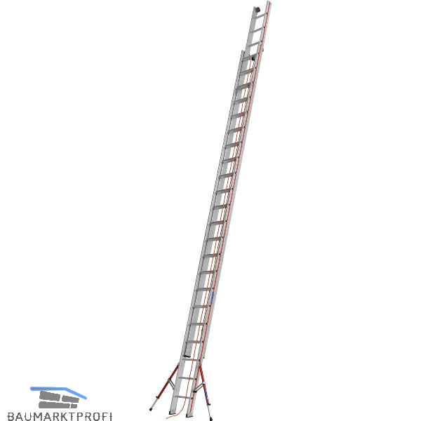 Leiterinnenbreite 300 mm (Oberteil). Sprossen aus stark profiliertem Strangpressprofil, daher erhöhte Rutschfestigkeit. Innen liegende Beschläge ermöglichen eine bessere Führung und mehr Sicherheit. Der Holm kann beim Ein- und Ausfahren außen gehalten werden, ohne Verletzungsgefahr. Alu-Klappfüße mit großer Auflagefläche und hoher Standfestigkeit, hochwertiges Seil ø 12 mm zur sicheren Höhenverstellung. Mit Wandlaufrollen aus Kunststoff. Tragkraft 150 kg.