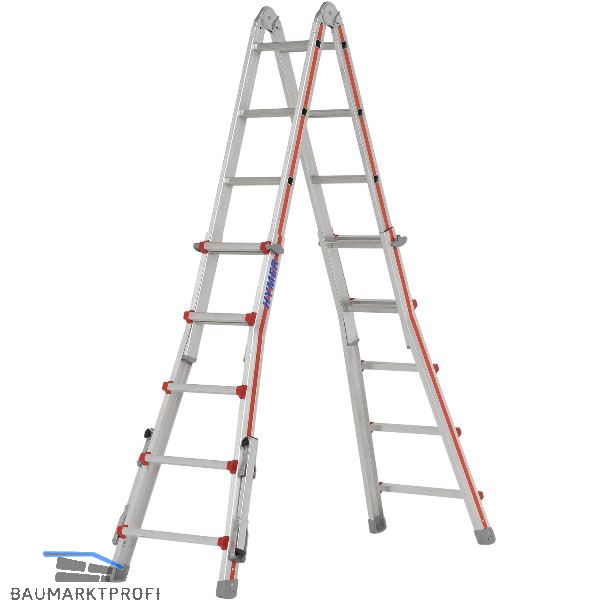 Verwendbar als längenverstellbare Anlegeleiter oder höhenverstellbare Stehleiter. Leiter in 250 mm Schritten höhenverstellbar. Geringer Platzbedarf bei Lagerung und Transport, standsichere Anpassung an Bodenunebenheiten oder Treppen möglich, Griffe der Sperrelemente aus kunststoffbeschichtetem Stahl, leicht bedienbares Stahl-Bügelgelenk, in Stehleiterposition muss das Gelenk vor dem Zusammenklappen der Leiter von Hand gelöst werden. Größe 4x6 mit Bolzengelenk. Ausklappbare Ausleger für höhere Standsicherheit. Tragkraft 150 kg.