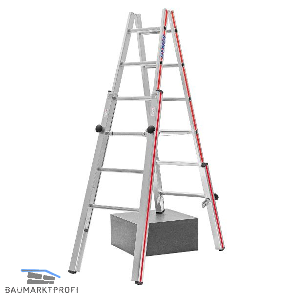 Stehleiter in konischer Form, von beiden Seiten begehbar, 4 stufenlos verstellbare Fußverlängerungen (2 × 1.000 mm und 2 × 370 mm), dadurch vielseitige Einsatzmöglichkeiten auf allen Treppenformen und unebenen Untergründen, Sprossen aus Walzprofil, mit Holm verpresste abgerundete Leiterfüße aus hochwertigem standfestem Kunststoff. Spreizsicherung durch hochfeste, 25 mm breite Perlongurte. Tragkraft 150 kg.