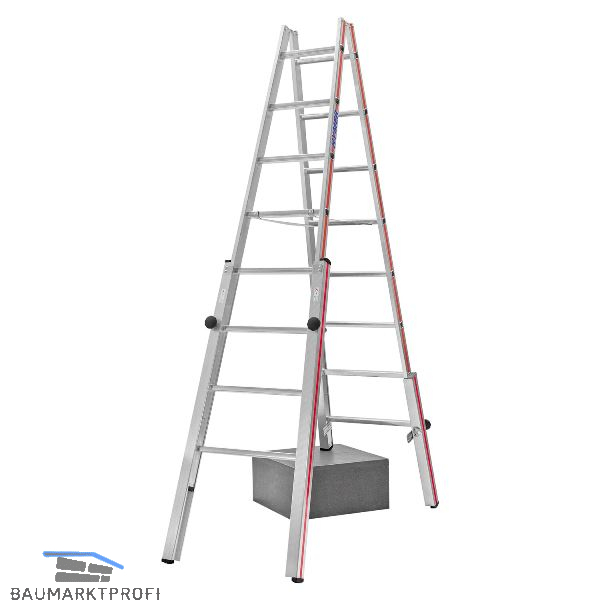 Stehleiter in konischer Form, von beiden Seiten begehbar, 4 stufenlos verstellbare Fußverlängerungen (2 × 1.000 mm und 2 × 370 mm), dadurch vielseitige Einsatzmöglichkeiten auf allen Treppenformen und unebenen Untergründen, Sprossen aus Walzprofil, mit Holm verpresste abgerundete Leiterfüße aus hochwertigem standfestem Kunststoff. Spreizsicherung durch hochfeste, 25 mm breite Perlongurte. Tragkraft 150 kg.