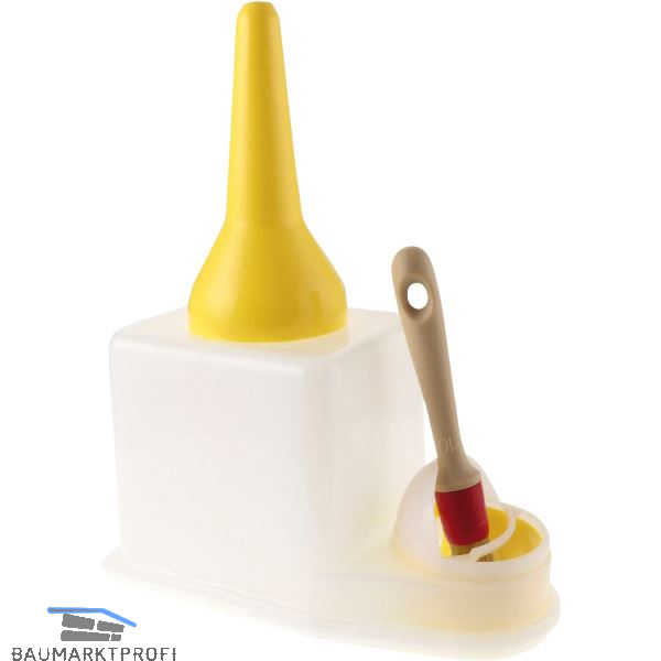 Praktischer Sparbehälter für den Auftrag von Leimen, Farben usw. Aus langlebigem Kunststoff mit Pinsel.