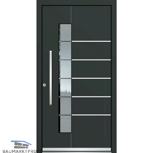 Feinstruktur Anthrazitgrau 71 334 FS außen und innen, Applikation außen Edelstahl Optik matt, 3-fach Isoglas Klarglas außen und innen – VSG 6 mm/Glas mittig - klar. MS 6780 Folie (Glasmotiv durchsichtig, an mittlerer Scheibe) 3 mm starke Aluminium Deckschichten außen und 2 mm innen, Thermisch getrennte Aluminium Bodenschwelle im Farbton silberfarbig EV 1 mit unsichtbarer Verschraubung.