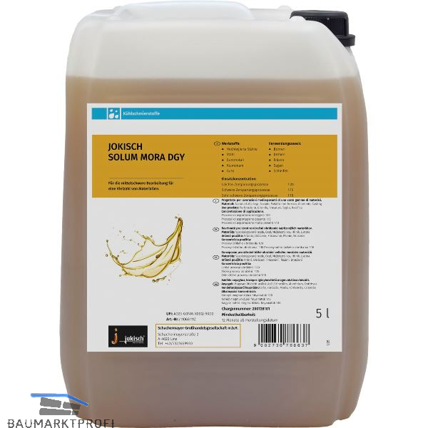Wassermischbarer mineralölhaltiger, Kühlschmierstoff, formuliert mit aromatenarmen, hoch ausraffinierten Grundölen. Spezielle Emulgatoren gewährleisten ein hervorragendes Leistungsspektrum und resultieren in eine semi-transparente Emulsion. Daher ist Jokisch Solum Mora DGY langzeitstabil und gewährleistet einen hohen Korrosionsschutz schon bei niedrigen Konzentrationen. Besonders ausgewählte AW-Additive ermöglichen eine Zerspanung mit hohen Schnittgeschwindigkeiten.