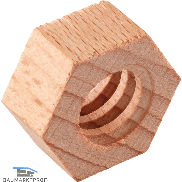6-Kant Mutter (24mm), Höhe: 12mm, Gewinde DM 15mmZu rund 90% werden die Muttern aus Buchenholz gefertigt.Je nach Verfügbarkeit kann auch Ahorn verwendet werden.